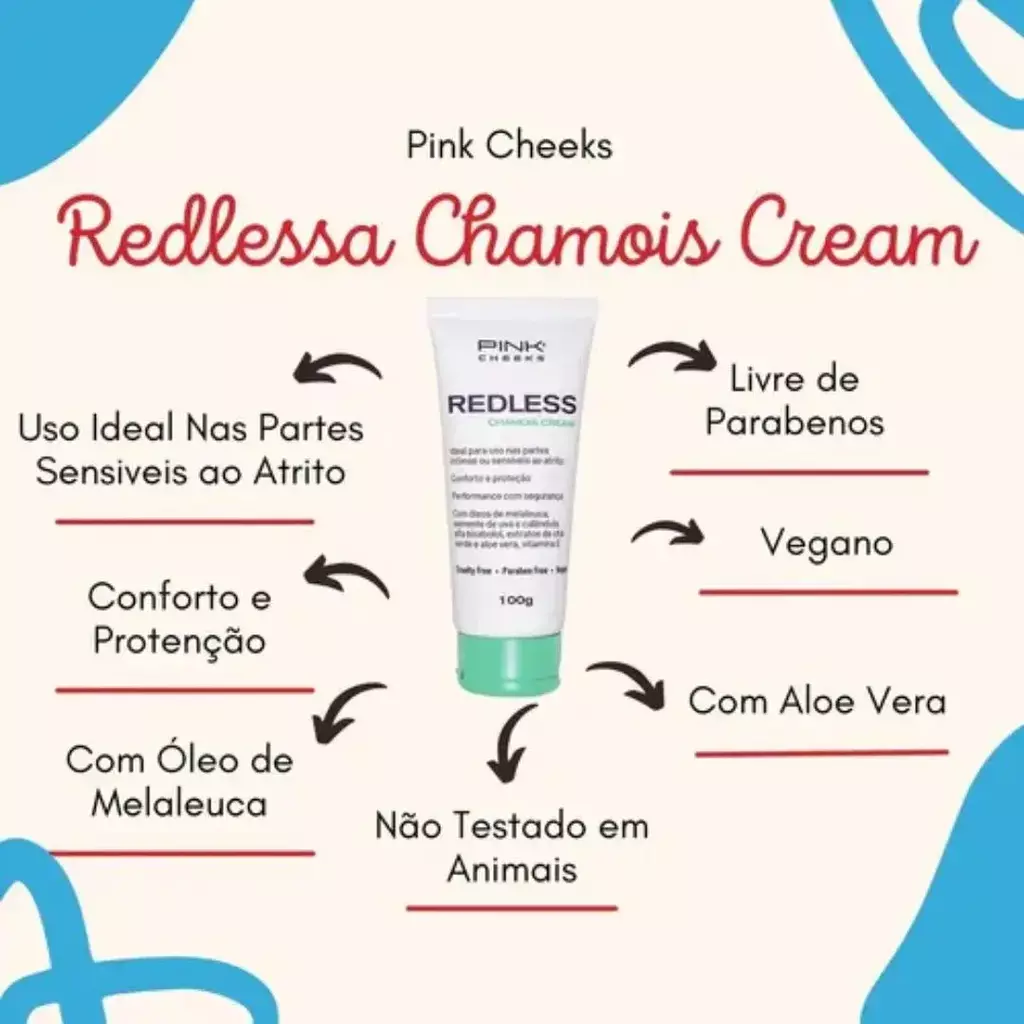 O REDLESS CHAMOIS CREAM vem como alternativa em creme para minimizar o atrito e evitar as assaduras em regiões mais sensíveis, permitindo melhor performance, proteção e segurança. Indicado para ser aplicado de forma generosa antes do treino ou competição, é ideal para uso nas regiões íntimas, virilha, parte interna dos braços e das coxas, axilas e demais partes do corpo suscetíveis ao atrito.