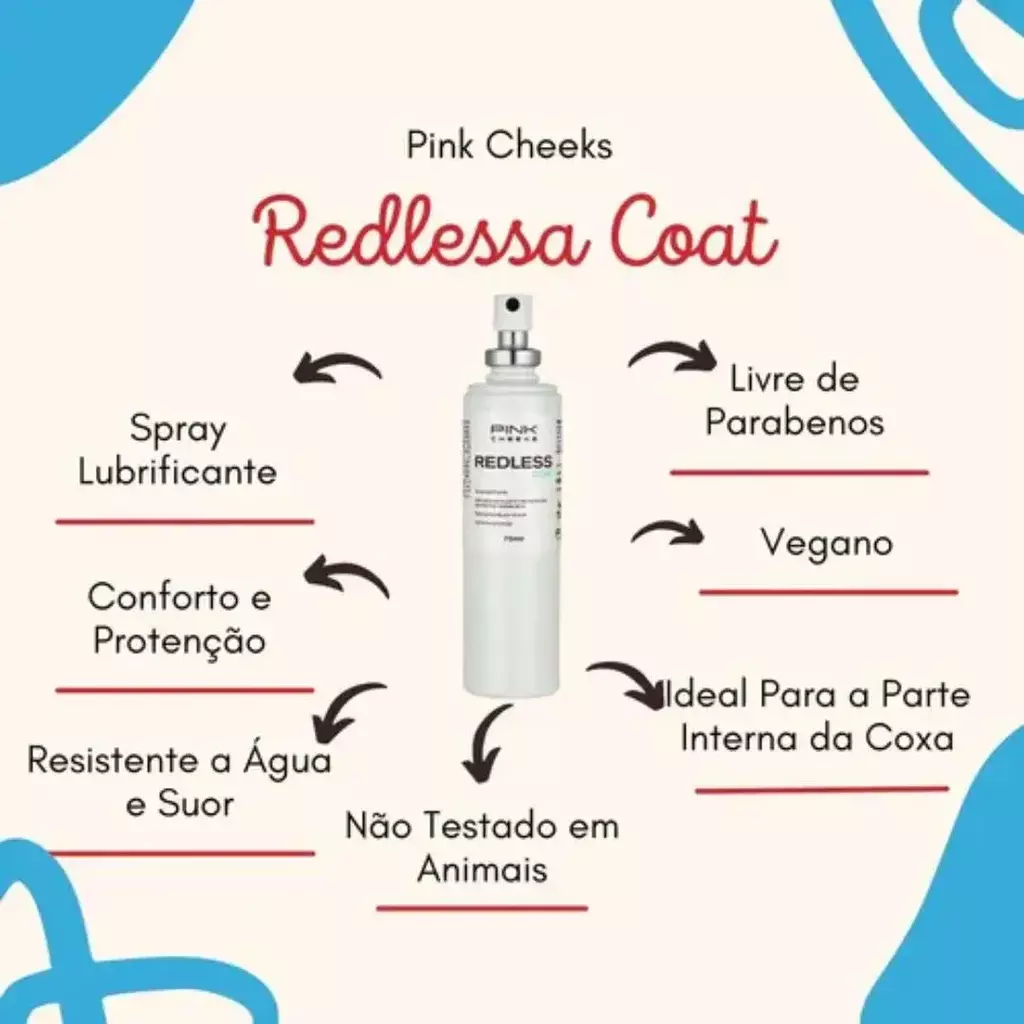 O REDLESS COAT é um spray antiatrito que forma uma película protetora sobre a pele, permitindo melhor deslizamento, minimizando o atrito e o aparecimento de bolhas, assaduras ou machucados - ideal para o esporte e rotina do dia a dia.